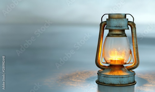 Vintage oil lantern casting a warm glow on a tranquil water surface at dusk