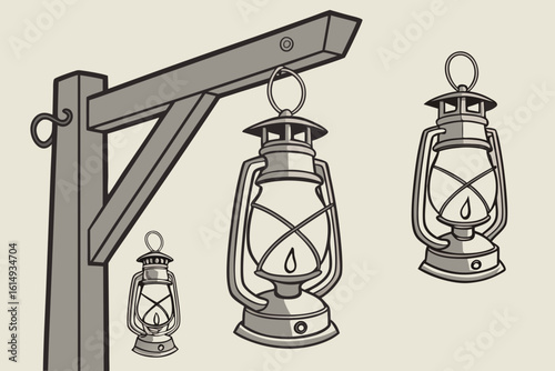 Vintage Oil Lanterns Hanging on Wooden Post.