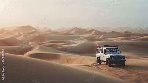 Vintage open top 4x4 SUV in the desert in Dubai, United Arab Emirates.