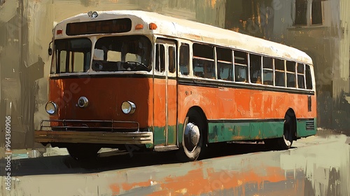 bus, vintage, orange, building, parked, wheel, tire, window, glasses, headlamp, front, side, painted, art, artwork, vehicle, transportation, old, weathered, rust-eaten, worn, green, beige, brown, grey, abstract, textured, graphic, digital, illustration, style, design, detail, line, shape, colours