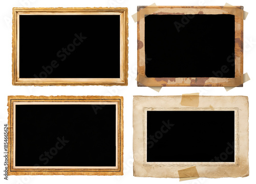 vintage, antique, old, retro, frame, photo frame, picture frame, album, memory, nostalgia, blank, empty, placeholder, black, background, isolated, white, border, decorative, ornate, gold, wood, paper, cardboard, distressed, aged, rustic, textured, tape, corner, collection, set, 4, classic, historical, art, design, template, scrapbook, display, montage