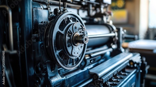 press, printing, machine, vintage, workshop, gear, paper, industry, machinery, factory, technology, metal, industrial, old, antique, equipment, texture, design, background, graphic, typography, process, manufacturing, work, craft, retro, history, publication, mechanical, engine, blue, dark, steel, closeup, detail, photo, image, illustration, concept, abstract, template, element, style