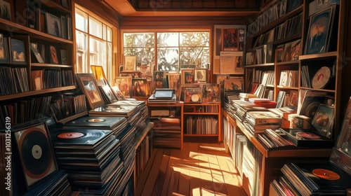 wood, shelf, record, vinyl, book, vintage, store, shop, interior, sunbeam, light, window, frame, sunlight, stack, album, wooden, collection, dusty, retro, music, old, brown, classic, nostalgic, display