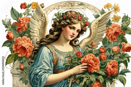Vintage retro antique angel portrait illustration with colorful botanical flowers on isolated white background, people, culture and religion theme concept texture design.