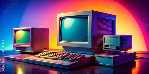 Vintage Retro Computer Portrait Photography with Colorful Backgrounds and Nostalgic Elements