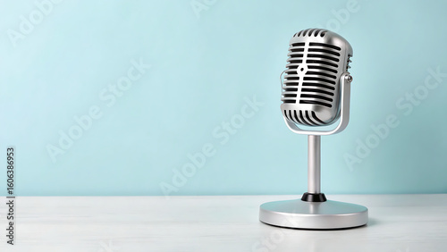 Vintage retro microphone on a stand against a clean light blue wall with a white surface in the foreground