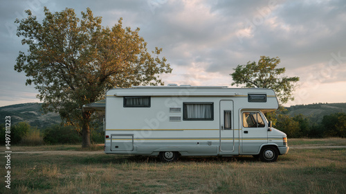 Vintage rv camper van parked in nature camping site for outdoor adventure travel and vacation lifestyle