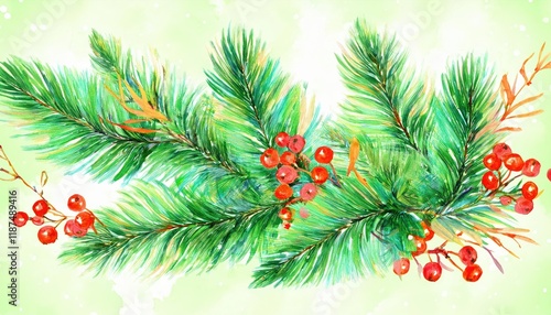 Vintage Scene of a Pine Tree Branch Adorned with Holly Among Spruce Fir Twigs in a Green Backdrop, Capturing a Wintery, Forest Mood