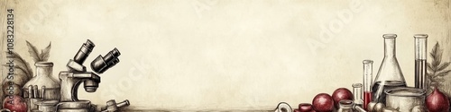 Vintage Science Laboratory Background with Microscope, Test Tubes, and Fresh Tomatoes for Scientific Research and Chemistry Studies in an Antique Style Design