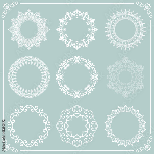 Vintage set of round elements. Different elements for design frames, cards, backgrounds and monograms. Classic patterns. Set of vintage round white patterns