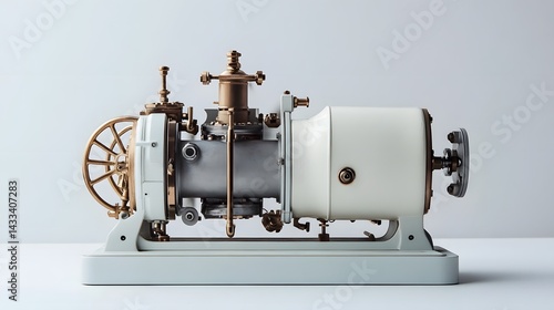 steam engine, model, vintage, antique, machinery, mechanism, industrial, technology, retro, brass, copper, white, grey, background, studio shot, detail, closeup, engineering, invention, power, machine, apparatus, cog, gear, wheel, pipe, metal, craftsmanship, design, object, artifact, historical, illustration, rendering, isolated, product, white background, minimalist, simple, modern