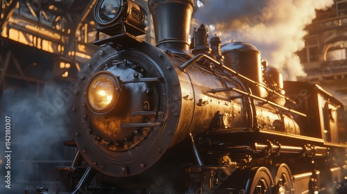 Vintage Steam Locomotive in Dramatic Lighting and Steam Effects