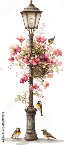 Vintage street lamp with pink blossoms and birds creating a charming urban nature scene