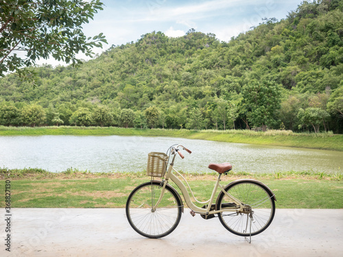 Vintage style bicycle parking on concrete road near lake and mountain.