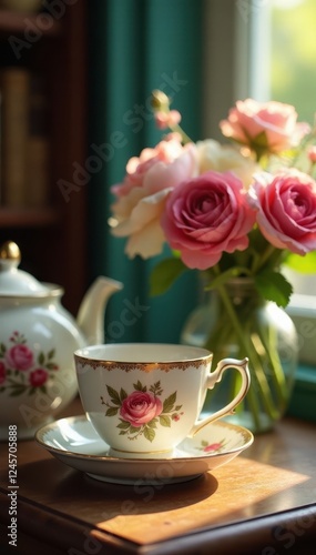 Vintage teapot, teacup, floral arrangement, warm light, table, drink, antique