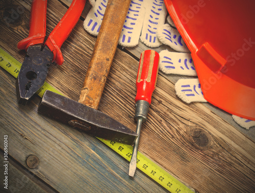 tool, vintage, hammer, plier, screwdriver, tape measure, bright, safety, helmet, glove, old, wooden, surface, metal, plastic, still life, aged, retro, repair, construction, tape, ribbon, measurement, object, texture, textured, nobody, craftsmanship