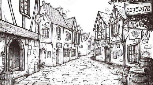 mediaeval, street, cobbled, town, shop, old, illustration, background, game, design, architecture, europa, village, history, fantasy, road, path, building, house, stone, rustic, vintage, antique, travel, adventure, fairy tale, story, scene, image, graphic, drawing, vignetting, monochrome, black, white, art, texture, pattern, retro, ancient, culture, heritage, landmark