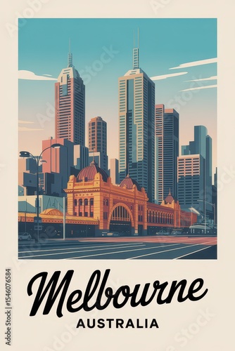 melbourne, australia, skyline, station, flinders, retro, vintage, poster, travel, architecture, building, urban, illustration, downtown, skyscraper, landmark, tour tourism, design, art, city landscape, tower, classic, old style, sunset, colourful, modern, historic, orange, structure, destination, city, metropolitan, scene, postcard, minimal, sky, railroad station, iconic, streetscape, famous, silhouette, heritage, scenery, wanderlust, print, artwork