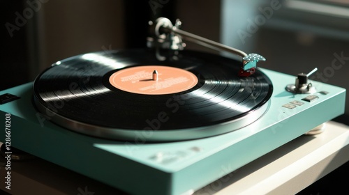 Vintage turntable playing vinyl record in warm natural light, retro music experience in modern interior setting