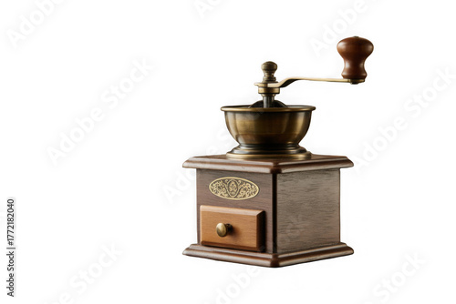 Vintage wooden manual coffee grinder with brass accents isolated isolated on transparent background