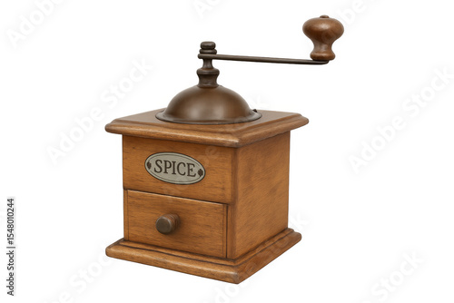 spice, grinder, wood, wooden, vintage, old, antique, kitchen, tool, utensil, cooking, favor, aroma, herb, transparent, background, isolated, cut, out, clipping, path, object, brown, traditional, manual, hand, crank, rustic, retro, design, element, culinary, gastronomy, ingredient, preparation, flavouring, seasoning, aromatic, mill, grated