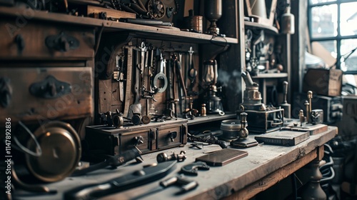 workshop, vintage, tool, machinery, rustic, antique, nostalgic, industrial, old, wood, metal, workspace, detail, traditional, retro, craft, mechanic, decor, texture, closeup