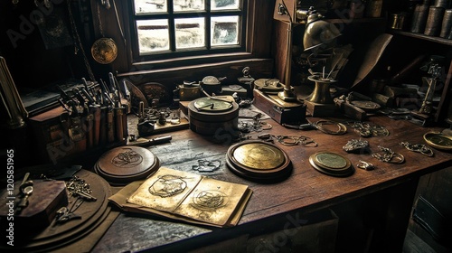 workshop, workbench, tool, vintage, antique, sketch, daylight, window, historical, setting, craft, artisan, metalwork, engraving, design, old, wooden, table, desk, room, interior, object, brass, gold, copper, machinery, detail, texture, background, dark, light, shadow, atmosphere, mystery, history, past, occupation, art, craftsmanship, retro, classic, illustration, photo, still life