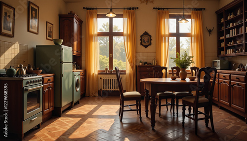 Vintage-inspired kitchen bathed in morning light, nostalgic warmth