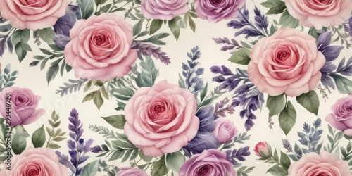 Vintage-inspired watercolor roses and lavender pattern, delicate, elegant, painting, soft colors, botanical motifs
