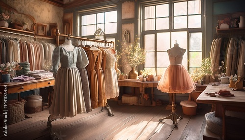 Vintage-Kleider auf antikem Kleiderständer im Retro-Atelier