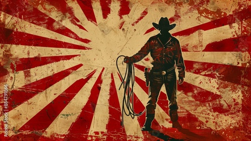 Vintage-poster vector art of a portrait of a man in a cowboy hat holding a lasso, set against a western starburst background, distressed art, rustic vintage art, flat 2d illustration art