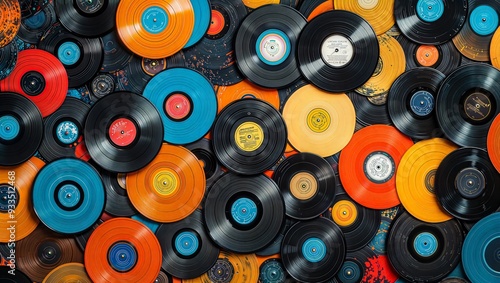 Vinyl Record Collection. Colorful arrangement of various vinyl records showcasing a mix of musical genres and eras.