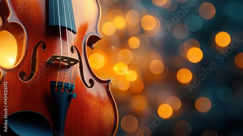 Violin on a bokeh background. A classic stringed instrument, polished wood, warm lighting, and out-of-focus lights create a beautiful image