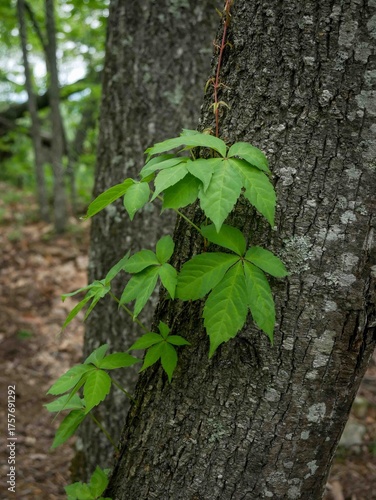 Virginia creeper plant growing on tree trunk in West Virginia appalachian forest