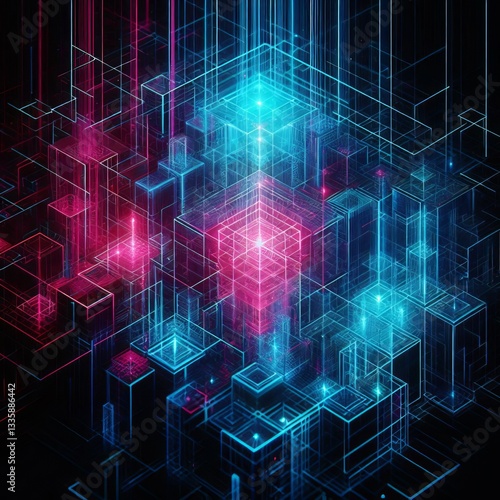 geometric, structured, high contrast, dark background, intense, technically, digital, abstract, art, neon, grid, electric, blue, pink, dark, black, background, futuristic, aesthetic, light, effect, high, contrast, render