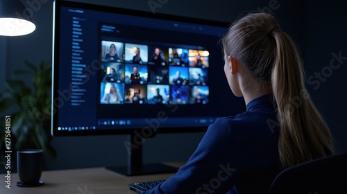 Virtual meeting engagement home office digital interaction dark environment back view remote collaboration