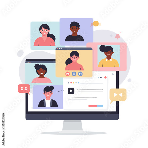 virtual, meeting, computer, screen, video, conference, call, online, remote, work, team, communication, collaboration, digital, technology, cyberspace, connection, people, diversity, illustration, graphic, design, presentation, network, interface, application, software, platform, user, avatar, profile, window, display, monitor, desktop, device, global, business, corporate, education, learning, training, seminar, discussion, interaction, engagement, community, social