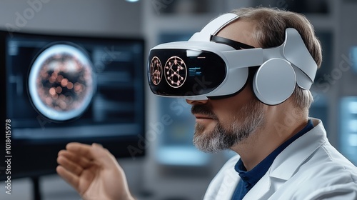 Virtual Reality Doctor: A focused medical professional wearing a VR headset, immersed in a digital realm of scientific data and potential breakthroughs.