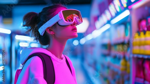virtual, reality, headset, goggles, future, technology, innovation, retail, shopping, supermarket, store, aisle, product, client, consumer, digital, online, e-business, life events, interactive, neon, light, glowing, modern, stylish, woman, girl, young, backpack, purple, pink, blue, futuristic, lifestyle, trend, advancement, display, screen, interface