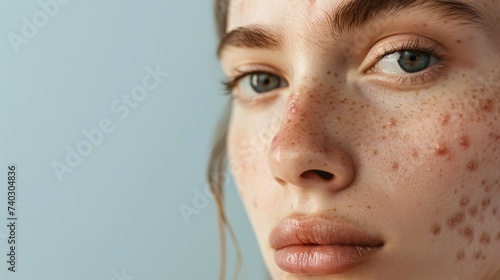 Visage d'une jeune femme avec de l'acnée sur fond gris » IA générative