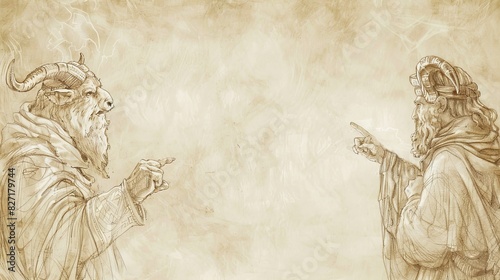 Vision of Beast and False Prophet in Revelation, Mark of Beast, Biblical Illustration, Beige Background, Copyspace
