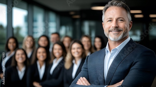 Visionary CEO posing confidently in front of a group of smiling team members in an office setting, full body wide angle