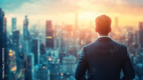 Visionary entrepreneur overlooking a blurred modern cityscape, symbolizing future financial success