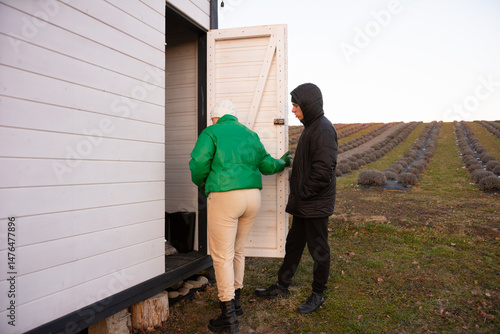 Visitors approach a rustic cabin surrounded by lavender fields at sunset, embracing the serene atmosphere and natural beauty of the countryside in late autumn