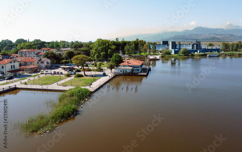 Vista aerea della passeggiata di Torre del Lago Puccini e del lago di Massaciuccoli, in Toscana.