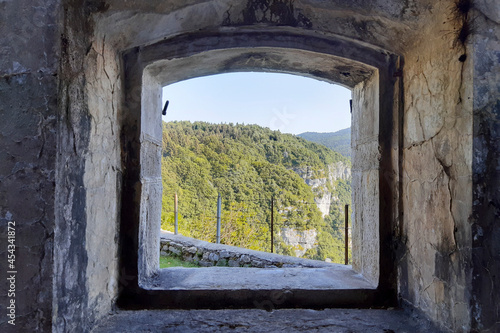 Vista panoramica sulle montagne da una finestra del forte Corbin in Val di Gevano in Veneto, viaggi e paesaggi in Italia
