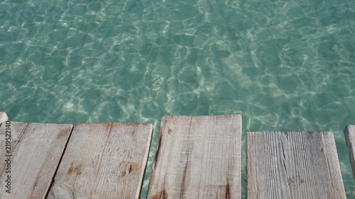 Vistas a aguas turquesas desde pasarela de madera (Fondo)