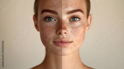 Visual comparison of acne-prone skin before and after treatment, glowing skin in 'after' section, infographic style, pastel colors, smooth textures, and healing highlights