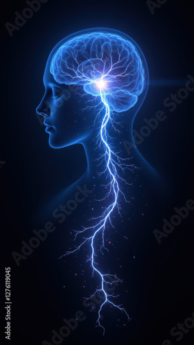 Visual representation of VNS (Vagus Nerve Stimulation) with a person's head and lightning bolts symbolizing electrical signals.