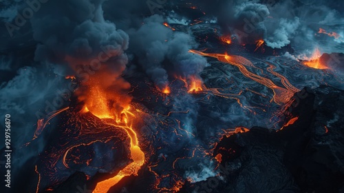 Visualize an aerial view of a volcano with a time-lapse effect, showing the transition from day to night and its glowing lava